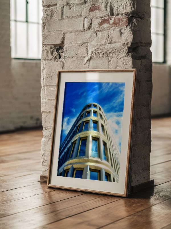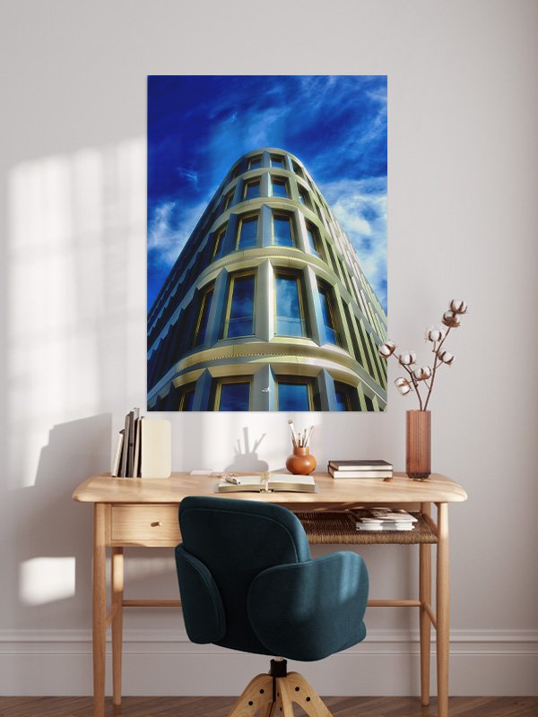 Die Fotografie "Color Tower (Color Version)" von ARTSHOT - Photographic Art ist eine eindrucksvolle Aufnahme eines modernen, architektonischen Gebäudes, das mit klaren Linien und einer faszinierenden Perspektive abgebildet ist. Das markante Design des Gebäudes wird durch den leuchtenden, blauen Himmel im Hintergrund hervorgehoben und schafft eine harmonische Balance zwischen urbaner Struktur und natürlicher Weite. Die goldfarbenen Fassade und der lebendige Kontrast von Licht und Schatten verleihen dem Bild Tiefe und Dynamik, sodass es in jedem Raum zum Blickfang wird.