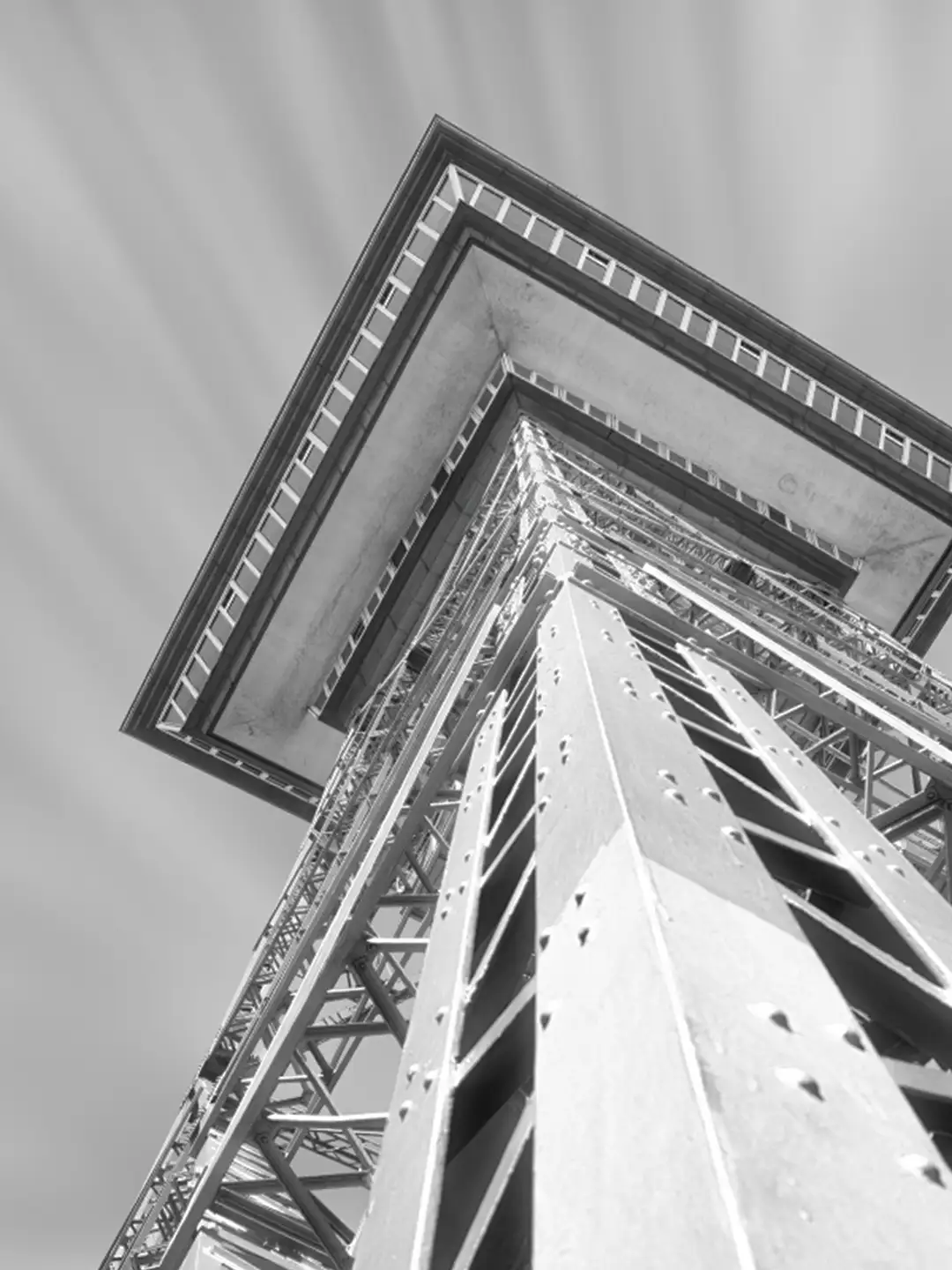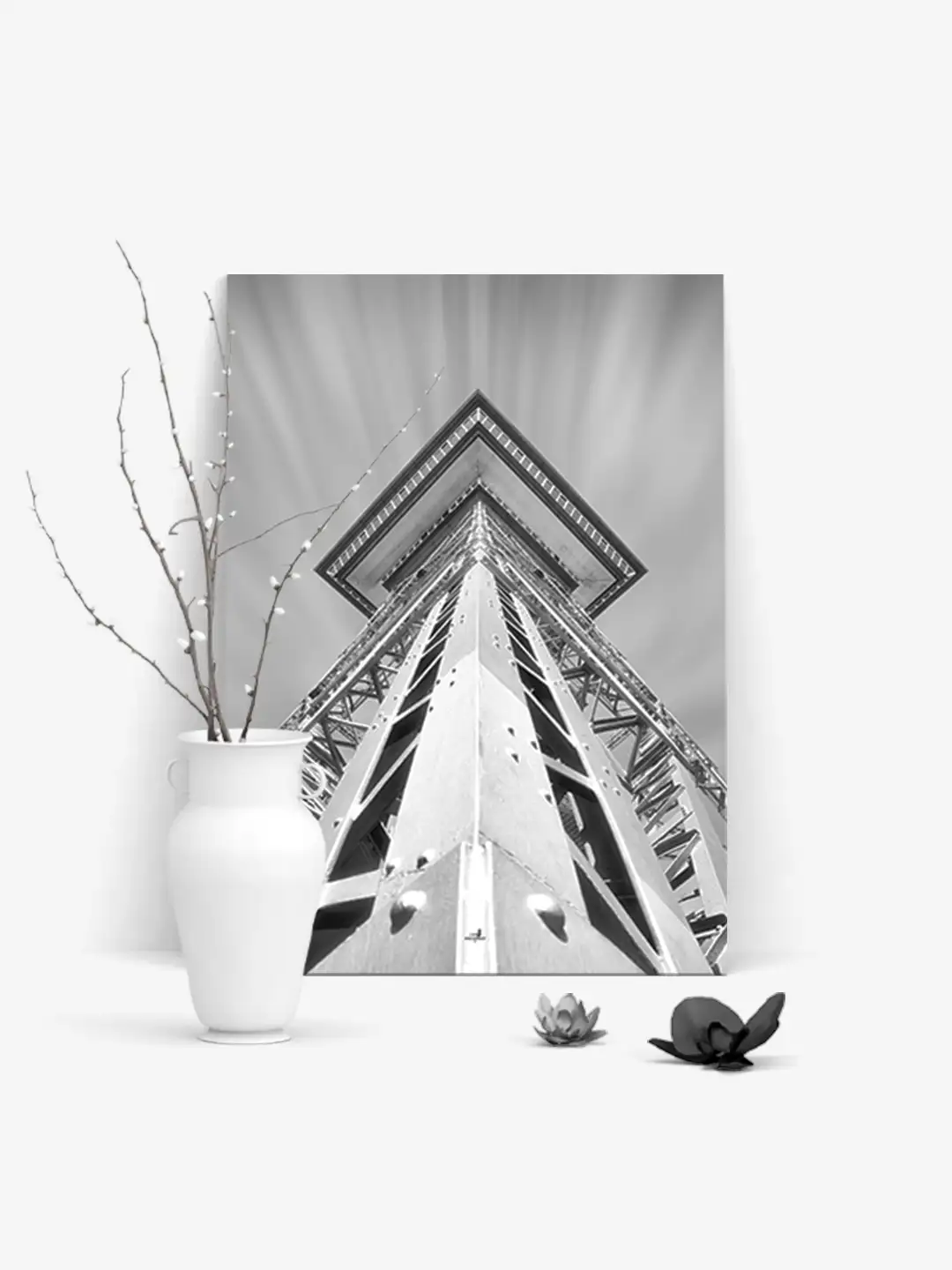 Das Wandbild „Funkturm Berlin“ zeigt das ikonische Berliner Wahrzeichen aus einer außergewöhnlichen Perspektive. Die streng symmetrische Perspektive lenkt den Blick entlang der Stahlkonstruktion nach oben und verleiht dem Motiv eine kraftvolle, monumentale Wirkung. In Schwarz-Weiß gehalten, betont die Fotografie die klare Linienführung, die industrielle Ästhetik und die architektonische Präzision des Funkturms.
