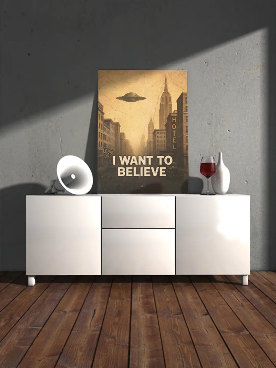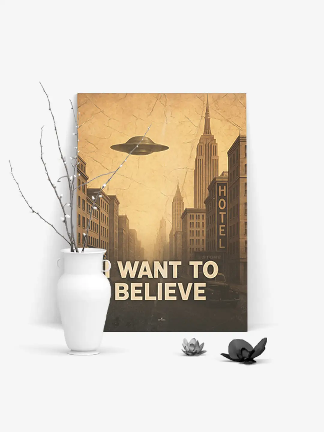 Der prägnante Schriftzug „I WANT TO BELIEVE“ steht im Zentrum des Bildes und verkörpert die menschliche Sehnsucht nach dem Unbekannten, nach Antworten jenseits des Sichtbaren.
