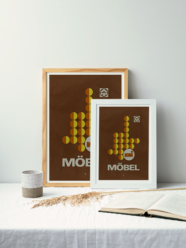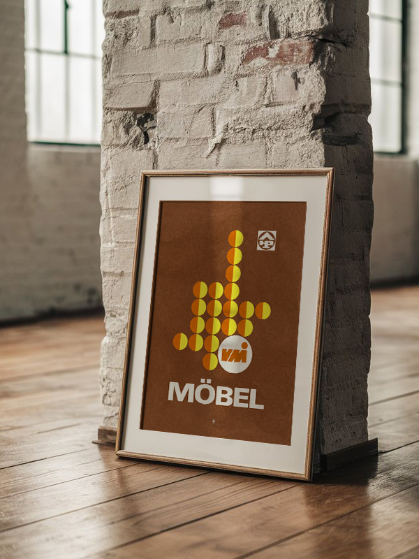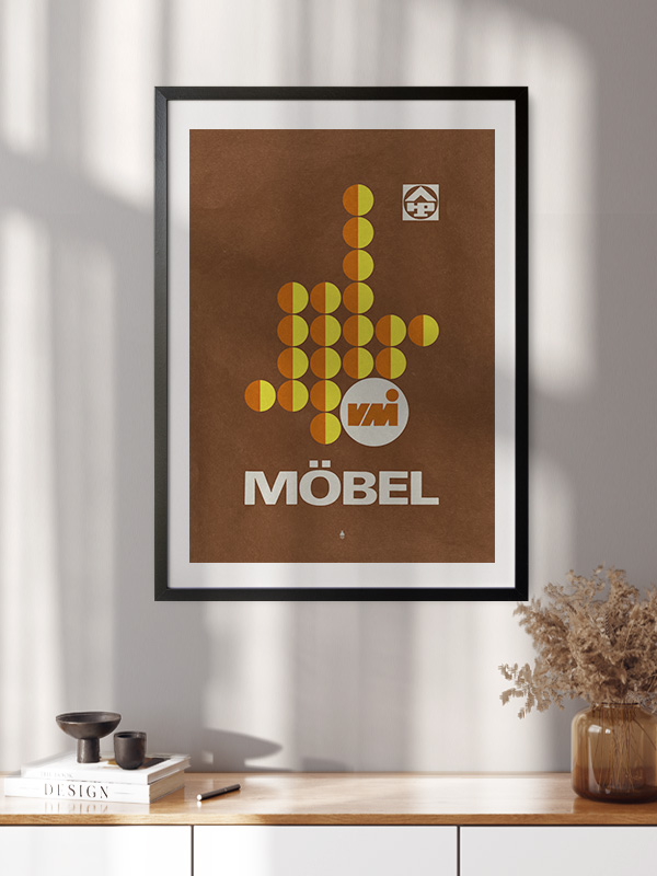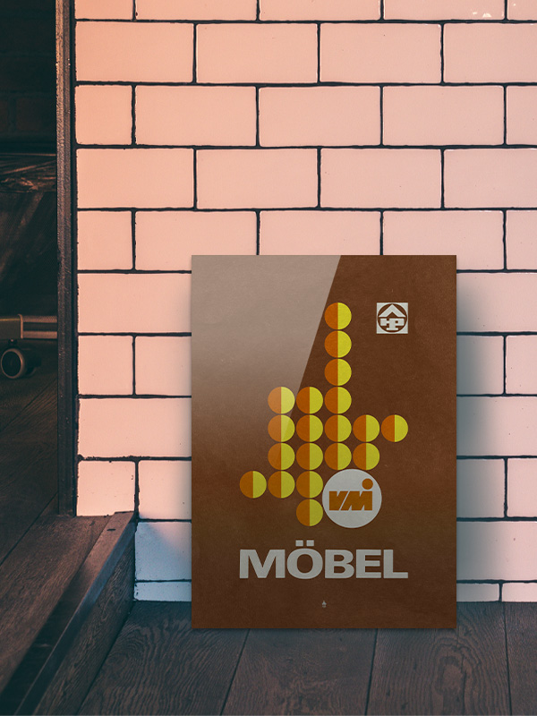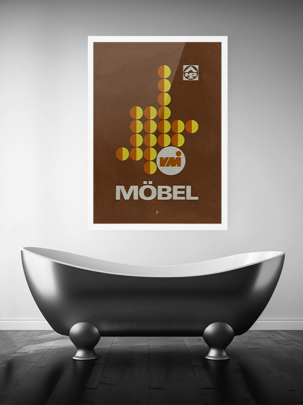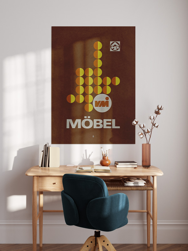 Das Werbeplakat ist charakteristisch für die grafische Gestaltung in der DDR der 1960er oder 1970er Jahre, mit klaren geometrischen Formen und einer begrenzten, aber ausdrucksstarken Farbpalette. Es vermittelt einen modernen, funktionalen Eindruck, der typisch für die Ästhetik der Möbelproduktion und Werbung in der DDR war. Volkseigenen Möbelkombinate der DDR.