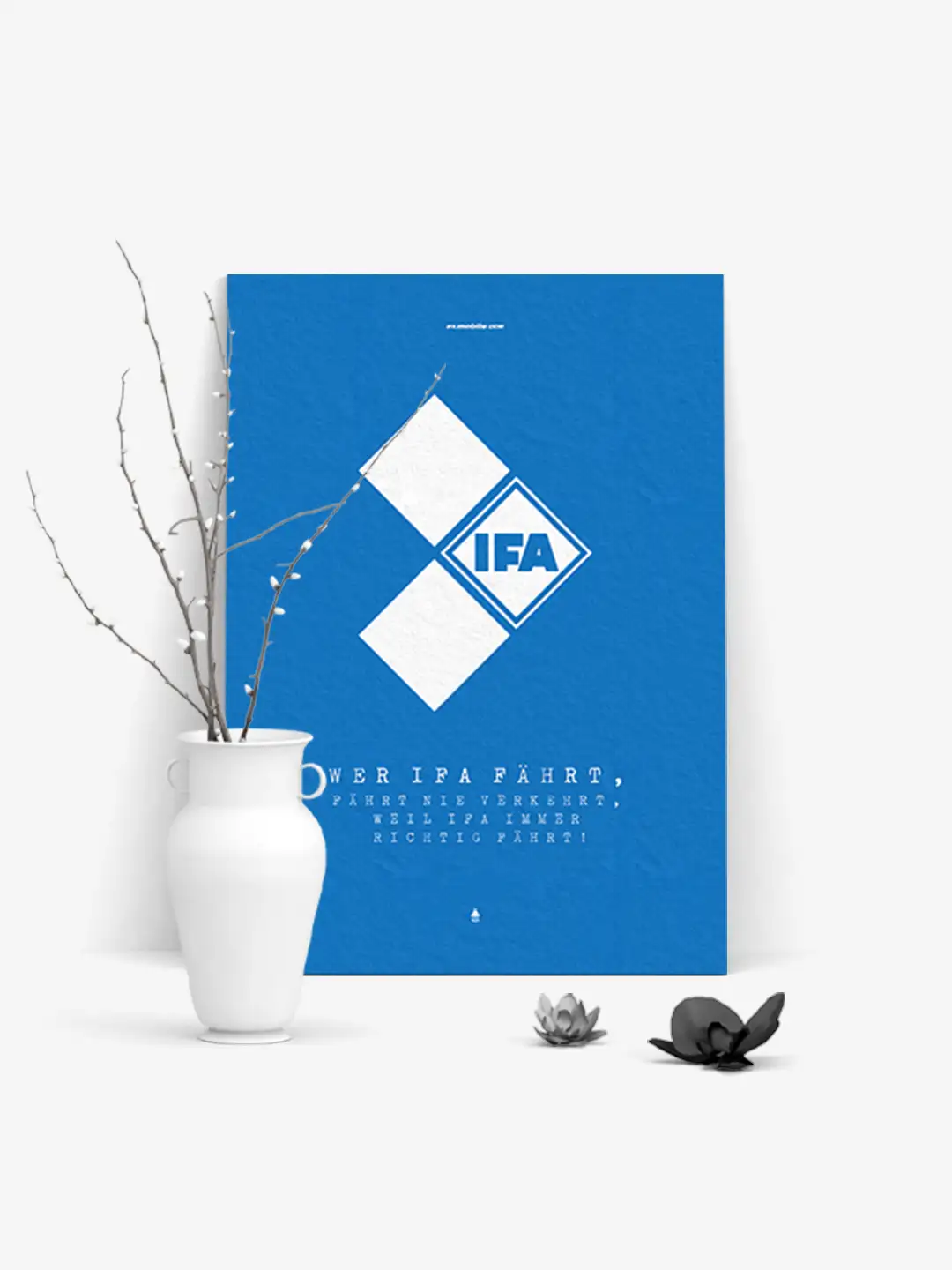 Dieses Motiv ist eine Hommage an die legendäre DDR-Automobilmarke IFA und überzeugt durch klares, reduziertes Grafikdesign mit starkem Wiedererkennungswert. Die ikonische blaue Farbfläche, das geometrische Logo und der prägnante Slogan verleihen dem Motiv eine zeitlose Ästhetik, die zwischen Industriegeschichte und moderner Minimalistik vermittelt.